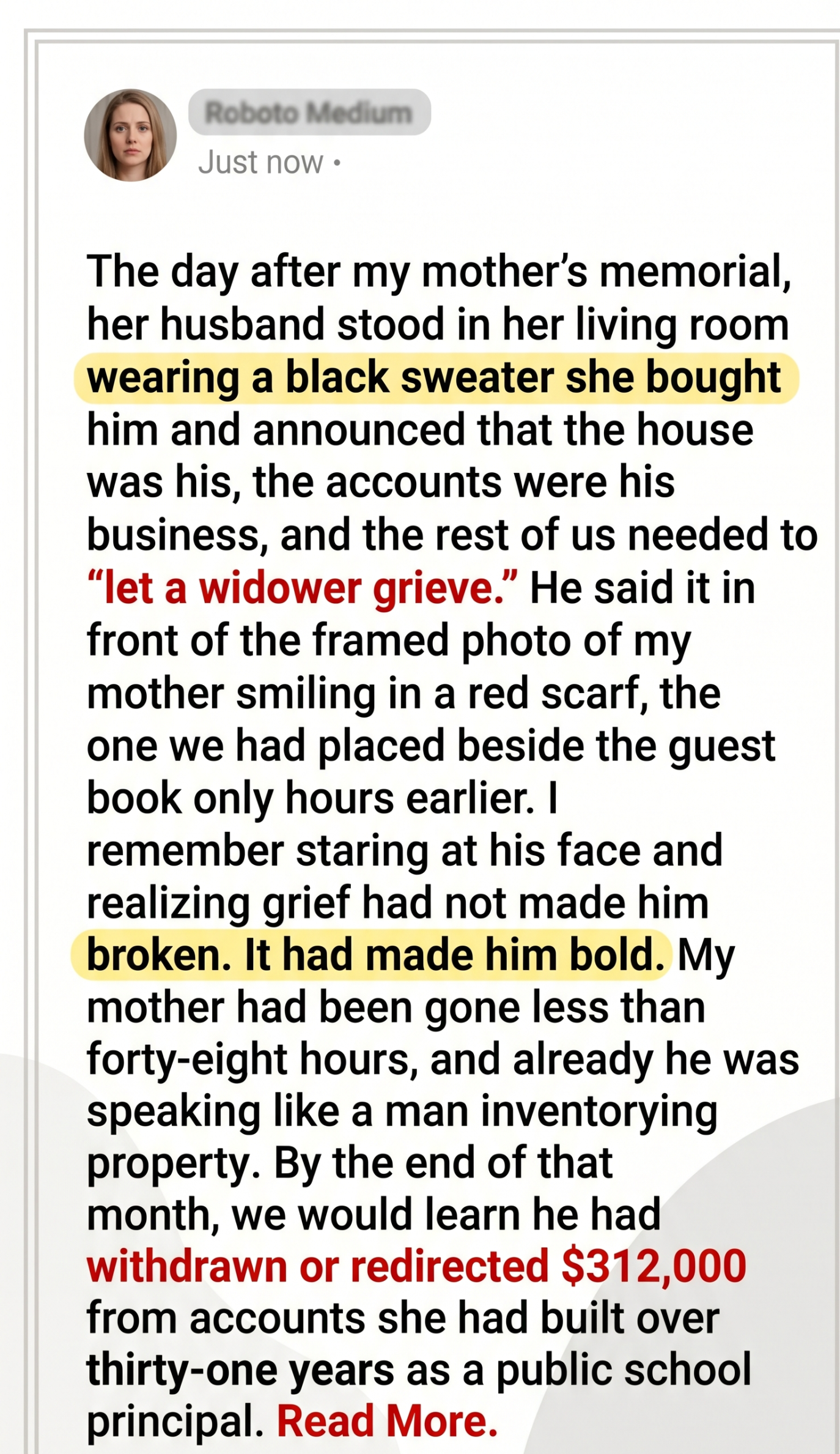 The day after my mother’s memorial, her husband stood in her living room wearing a black sweater she bought him and announced that the house was his, the accounts were his business, and the rest of us needed to “let a widower grieve.” He said it in front of the framed photo of my mother smiling in a red scarf, the one we had placed beside the guest book only hours earlier. I remember staring at his face and realizing grief had not made him broken. It had made him bold. My mother had been gone less than forty-eight hours, and already he was speaking like a man inventorying property. By the end of that month, we would learn he had withdrawn or redirected $312,000 from accounts she had built over thirty-one years as a public school principal.