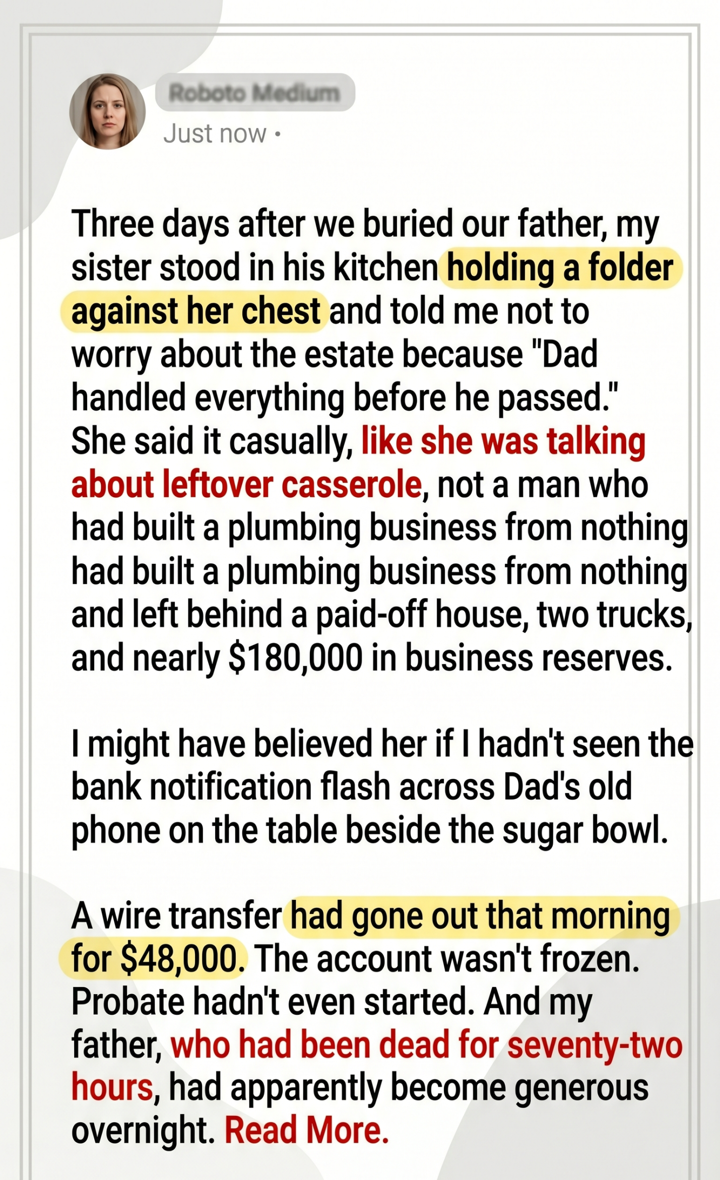 Three days after we buried our father, my sister stood in his kitchen holding a folder against her chest and told me not to worry about the estate because “Dad handled everything before he passed.” She said it casually, like she was talking about leftover casserole, not a man who had built a plumbing business from nothing and left behind a paid-off house, two trucks, and nearly $180,000 in business reserves. I might have believed her if I hadn’t seen the bank notification flash across Dad’s old phone on the table beside the sugar bowl. A wire transfer had gone out that morning for $48,000. The account wasn’t frozen. Probate hadn’t even started. And my father, who had been dead for seventy-two hours, had apparently become generous overnight.
