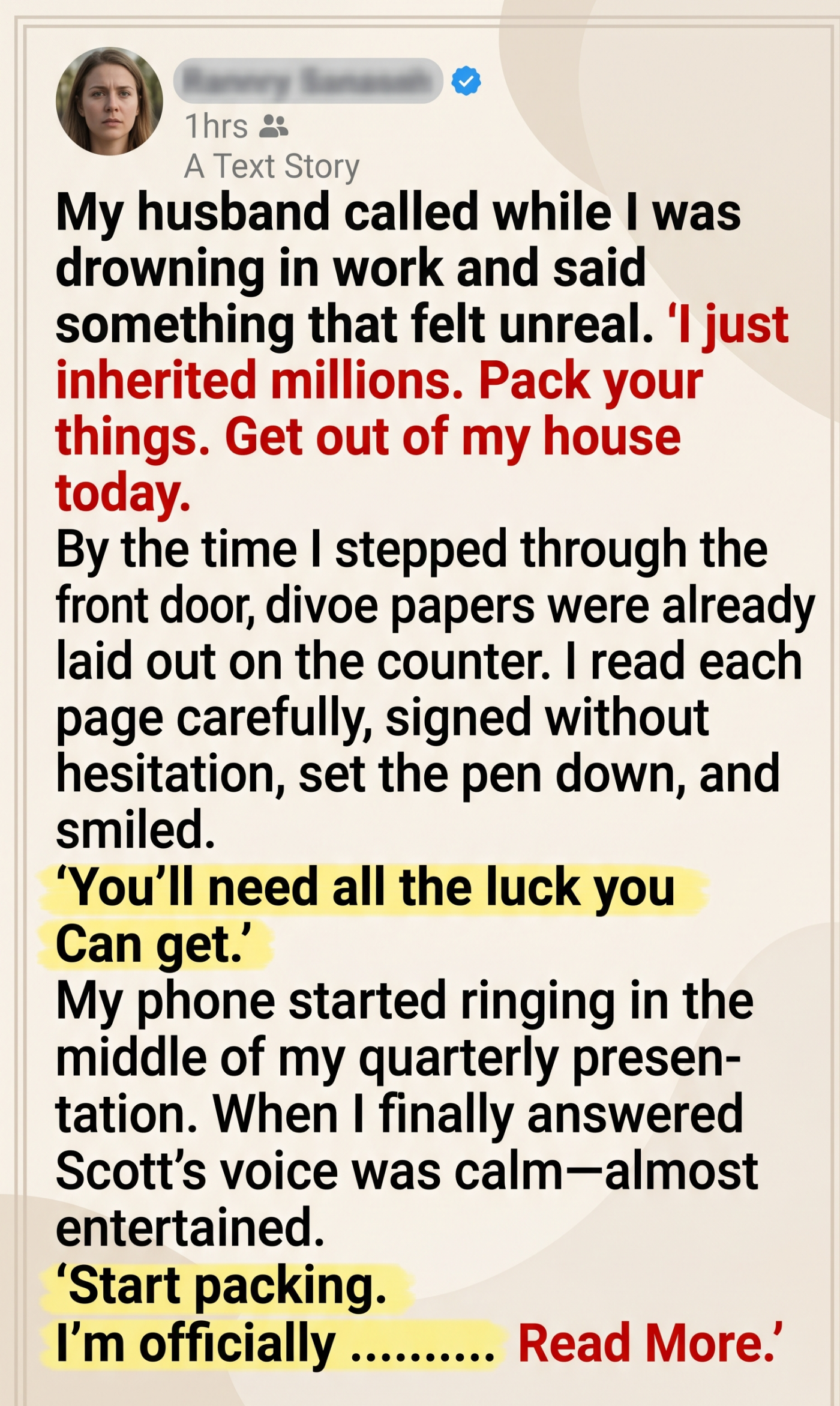 My husband called while I was drowning in work and said something that felt unreal. “I just inherited millions. Pack your things. Get out of my house today.” By the time I stepped through the front door, divorce papers were already laid out on the counter. I read each page carefully, signed without hesitation, set the pen down, and smiled. “You’ll need all the luck you can get.”