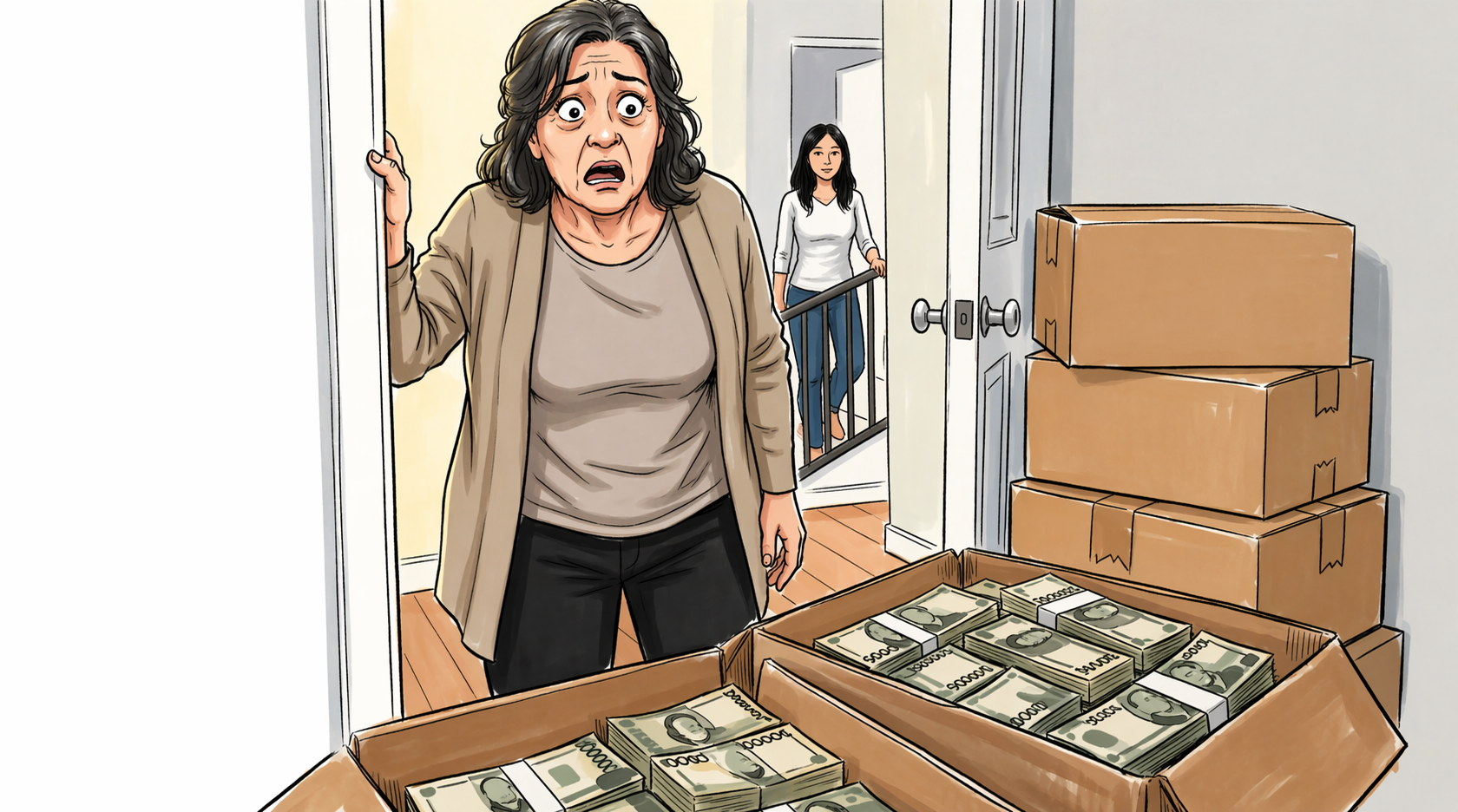 She quickly moved to the boxes, pulling out several thick stacks of cash and stuffing them into a plain black bag. Then she reached deeper—lifting the false bottom of one box.