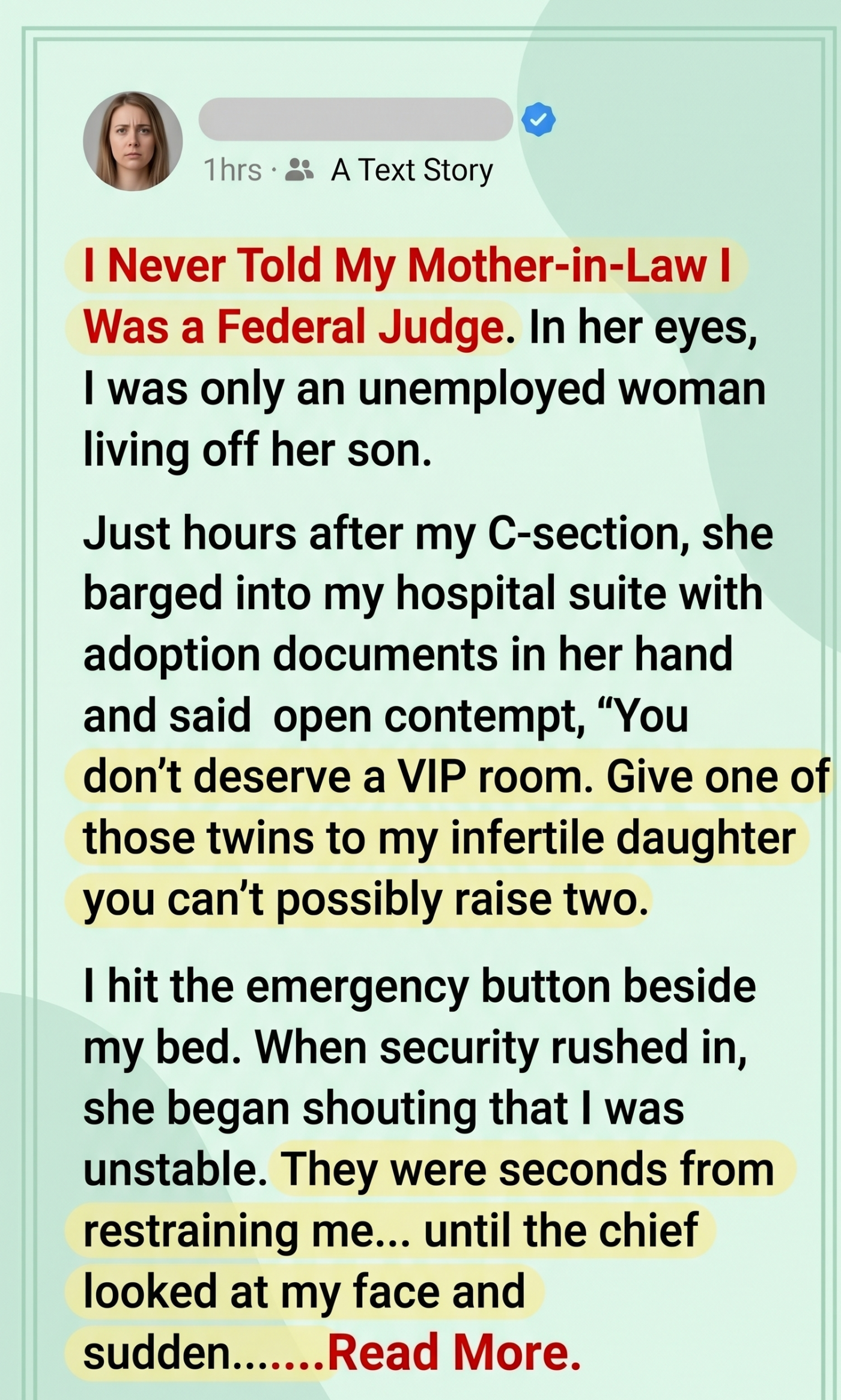 I Never Told My Mother-in-Law I Was a Federal Judge. In her eyes, I was only an unemployed woman living off her son. Just hours after my C-section, she barged into my hospital suite with adoption documents in her hand and said with open contempt, “You don’t deserve a VIP room. Give one of those twins to my infertile daughter — you can’t possibly raise two.” I hit the emergency button beside my bed. When security rushed in, she began shouting that I was unstable. They were seconds from restraining me… until the chief looked at my face and suddenly froze in recognition.