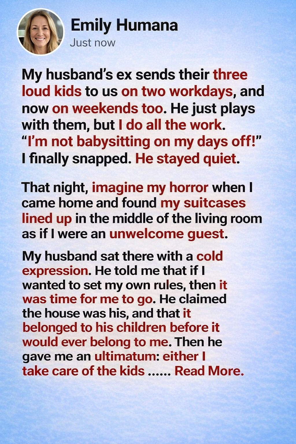 That night, imagine my horror when I came home and found my suitcases lined up in the middle of the living room as if I were an unwelcome guest. My husband sat there with a cold expression. He told me that if I wanted to set my own rules, then it was time for me to go. He claimed the house was his, and that it belonged to his children before it would ever belong to me.