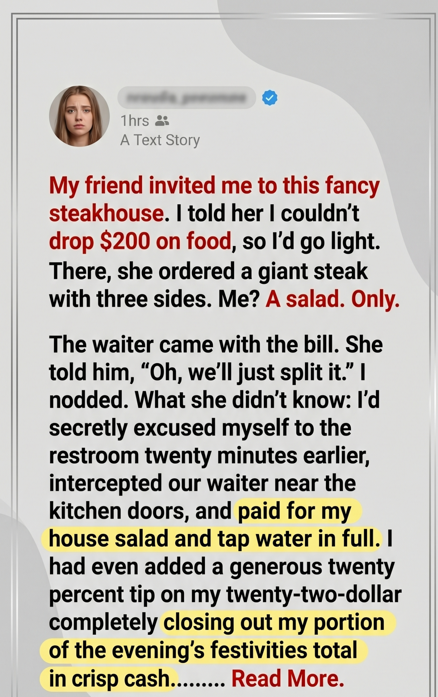 My friend invited me to this fancy steakhouse. I told her I couldn’t drop $200 on food, so I’d go light. There, she ordered a giant steak with three sides. Me? A salad. Only. The waiter came with the bill. She told him, “Oh, we’ll just split it.” I nodded. What she didn’t know: I’d secretly excused myself to the restroom twenty minutes earlier, intercepted our waiter near the kitchen doors, and paid for my single house salad and tap water in full. I had even added a generous twenty percent tip on my twenty-two-dollar total, completely closing out my portion of the evening’s festivities in crisp cash. The black, leather-bound checkbook currently resting on the pristine white tablecloth didn’t contain our combined total. It contained hers, and hers alone.