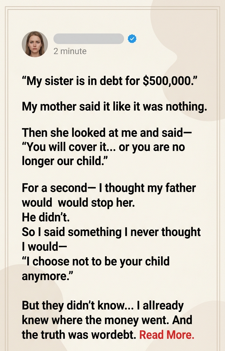 “My sister is in debt for $500,000,” my mother declared, her tone so cold it seemed to chill the entire room.