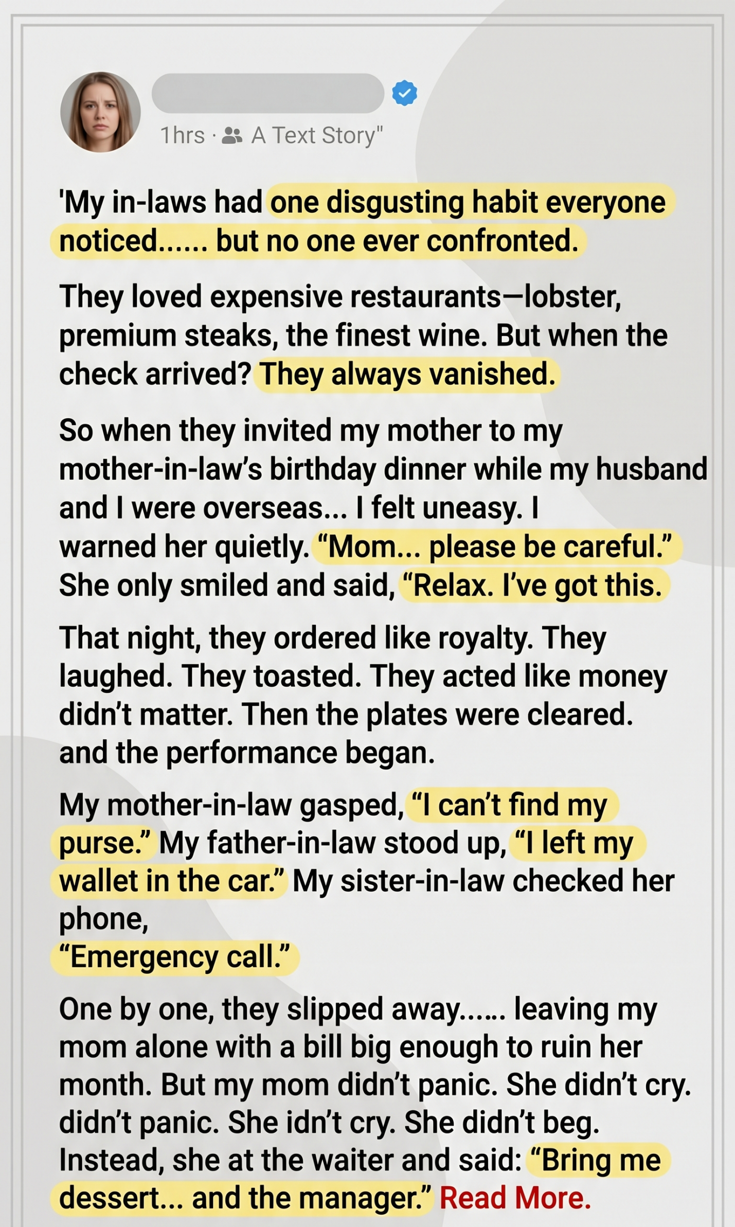They loved the best restaurants in town. The ones with candlelight tables, wine menus thicker than books, and steaks so expensive you almost felt guilty ordering them.