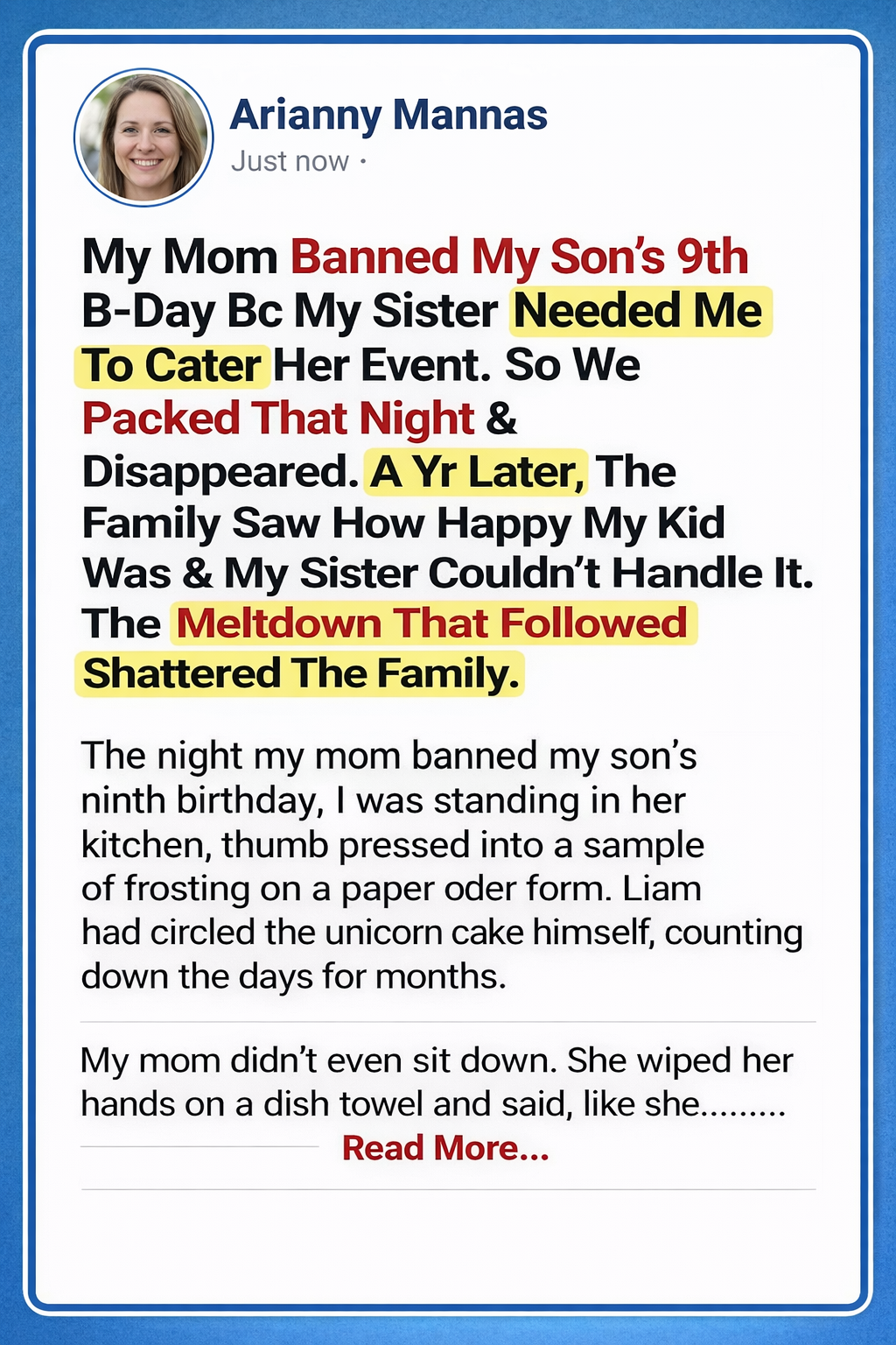 The night my mom banned my son’s ninth birthday, I was standing in her kitchen, thumb pressed into a sample of frosting on a paper order form. Liam had circled the unicorn cake himself, counting down the days for months.