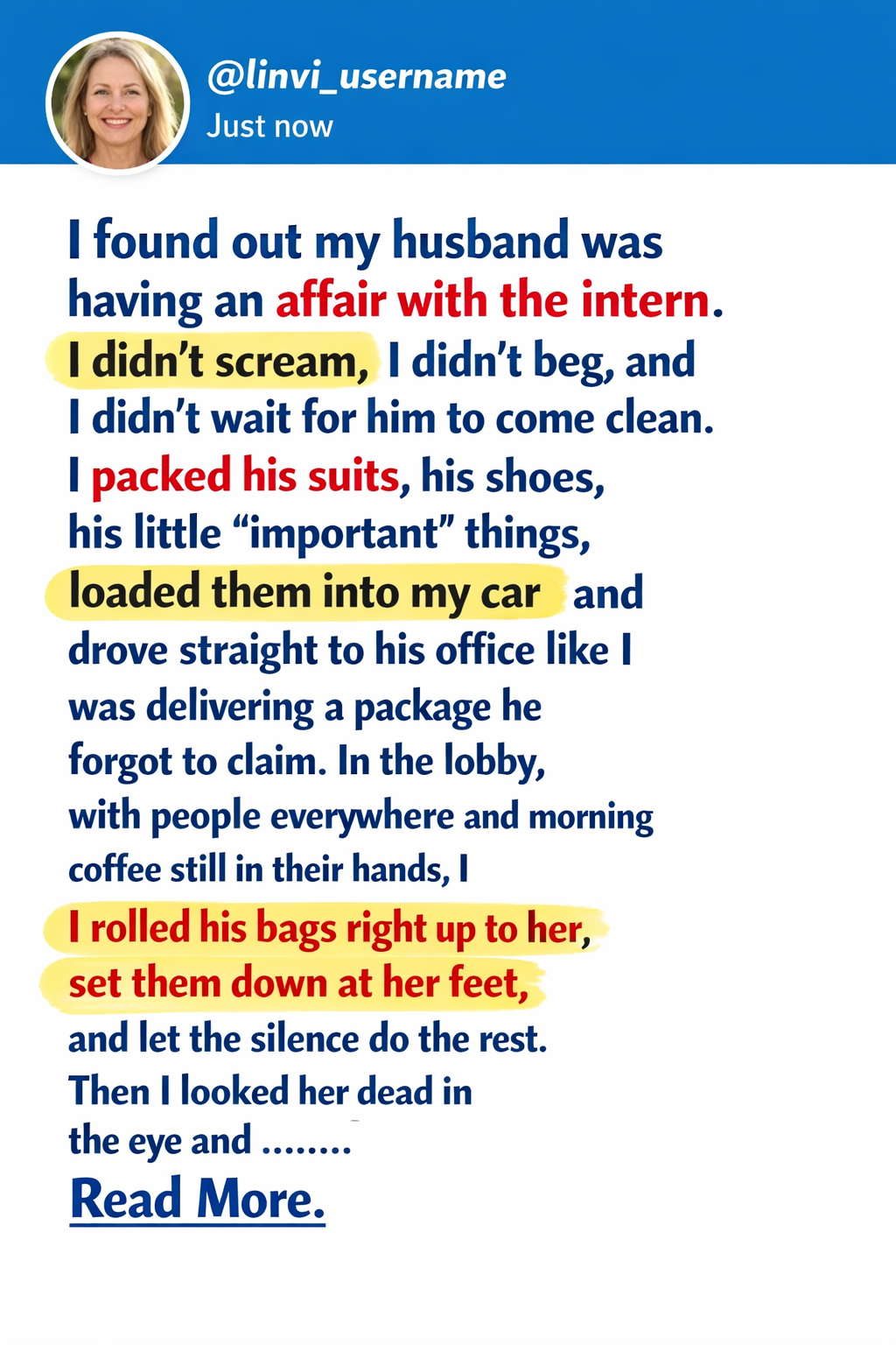 I found out my husband was having an affair with the intern. I didn’t scream, I didn’t beg, and I didn’t wait for him to come clean. I packed his suits, his shoes, his little “important” things, loaded them into my trunk, and drove straight to his office like I was delivering a package he forgot to claim. In the lobby, with people everywhere and morning coffee still in their hands, I spotted her by the elevators. I rolled his bags right up to her, set them down at her feet, and let the silence do the rest. Then I looked her dead in the eye and said, congratulations—he’s all yours.