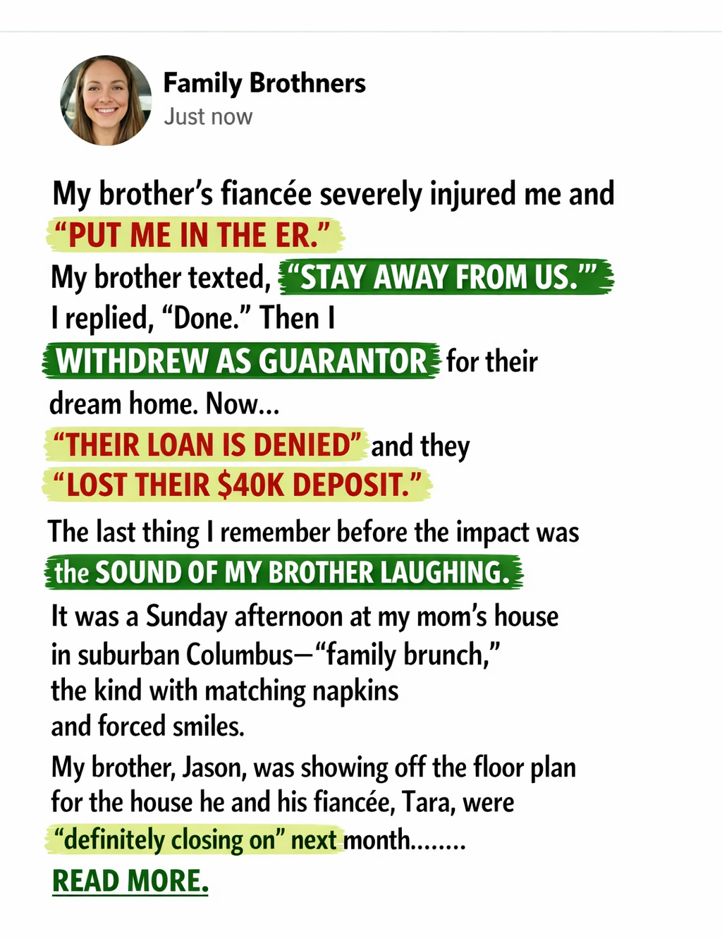 My brother’s fiancée severely injured me and put me in the ER. My brother texted, “Stay away from us.” I replied, “Done.” Then I withdrew as guarantor for their dream home. Now… their loan is denied and they lost their $40K deposit.