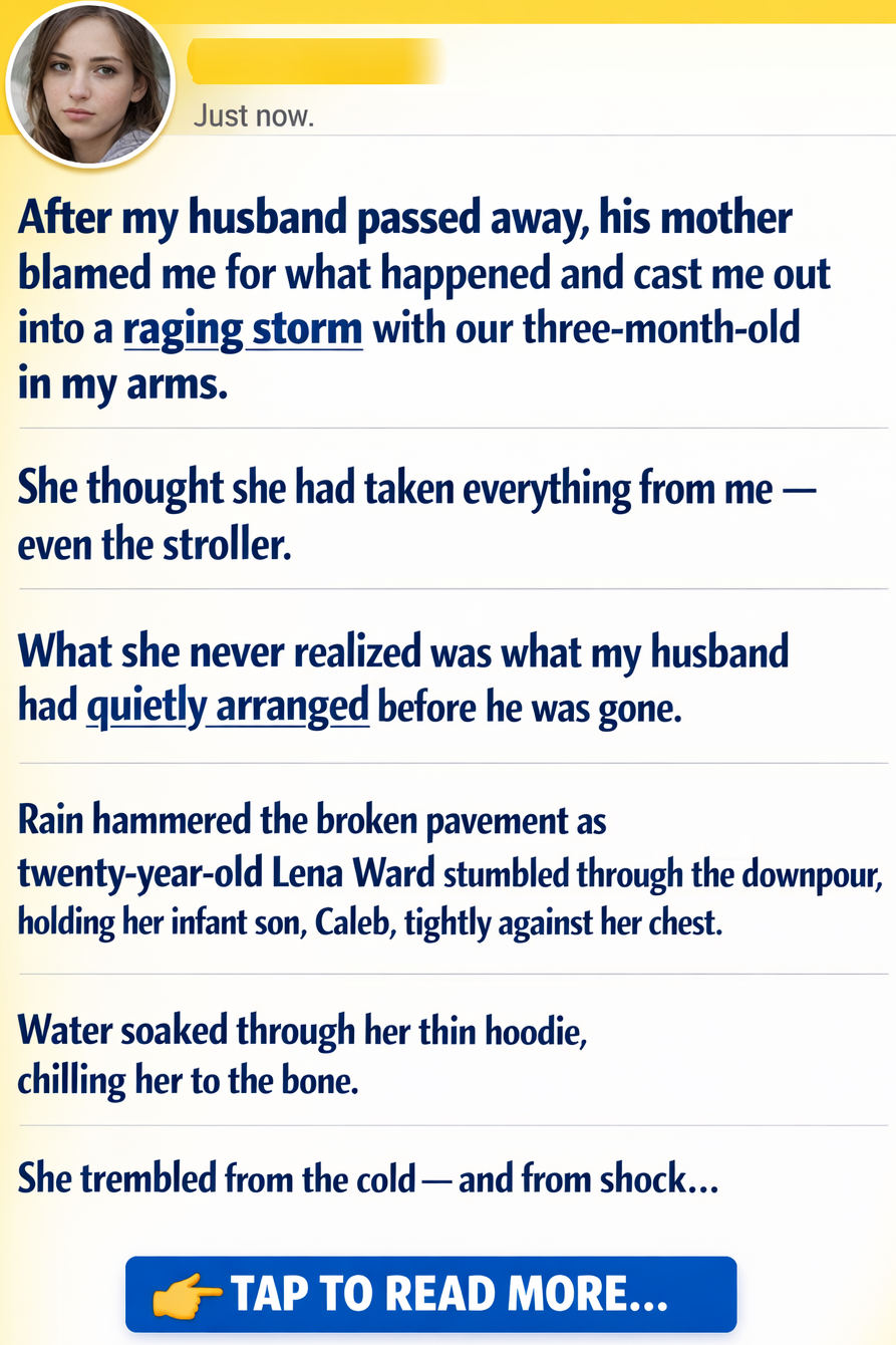 Rain hammered the broken pavement as twenty-year-old Lena Ward stumbled through the downpour, holding her infant son, Caleb, tightly against her chest. Water soaked through her thin hoodie, chilling her to the bone. She trembled from the cold—and from shock. It had only been nine days since the accident that took Ethan, the one person who had always stood between her and the world’s cruelty. With him gone, that shield had disappeared, and his mother had turned on her.