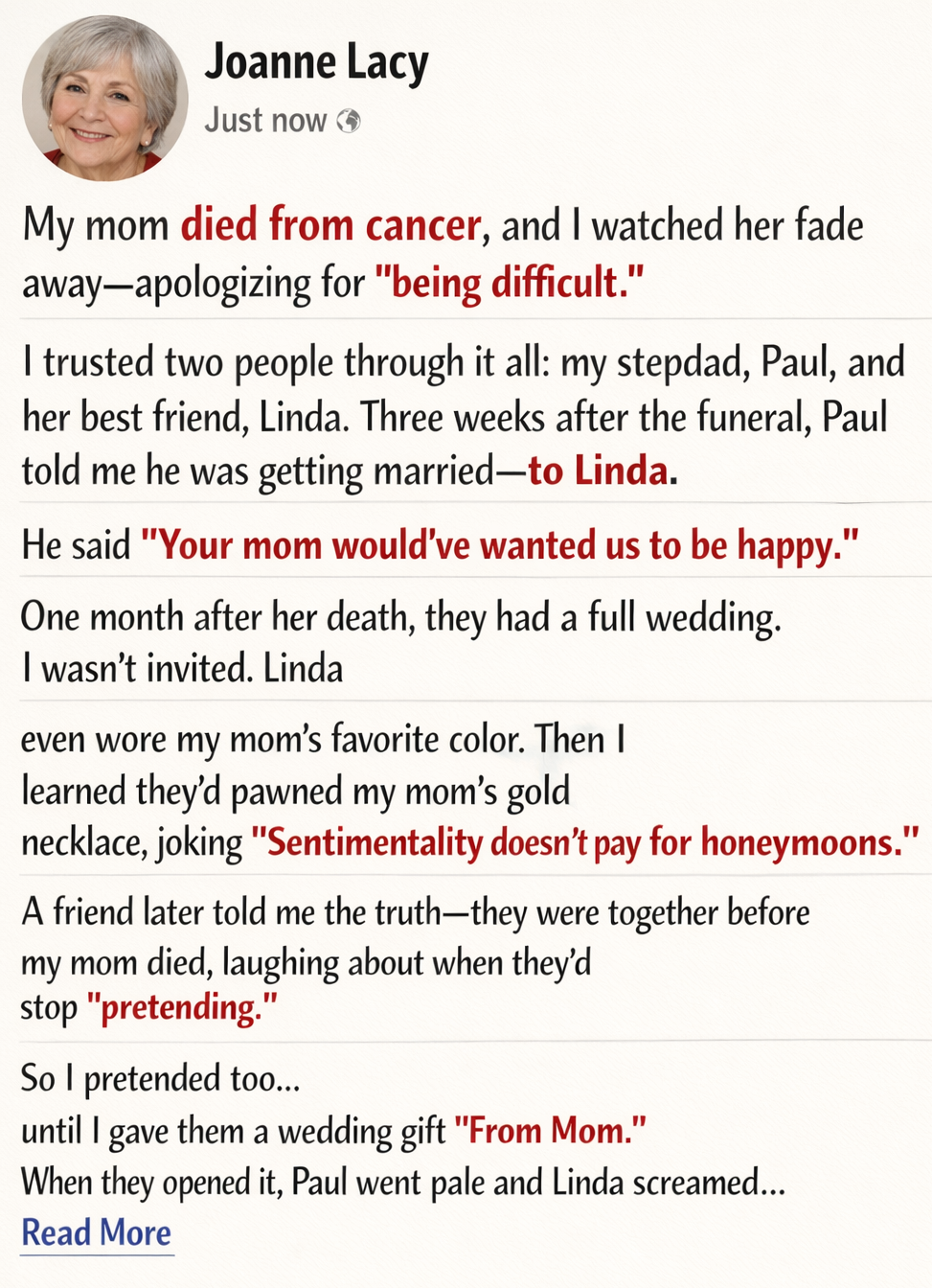 “Paul and Linda. They were involved before your mom passed. I saw them together in the hospital parking lot more than once. Holding hands. Kissing. And I heard things.”