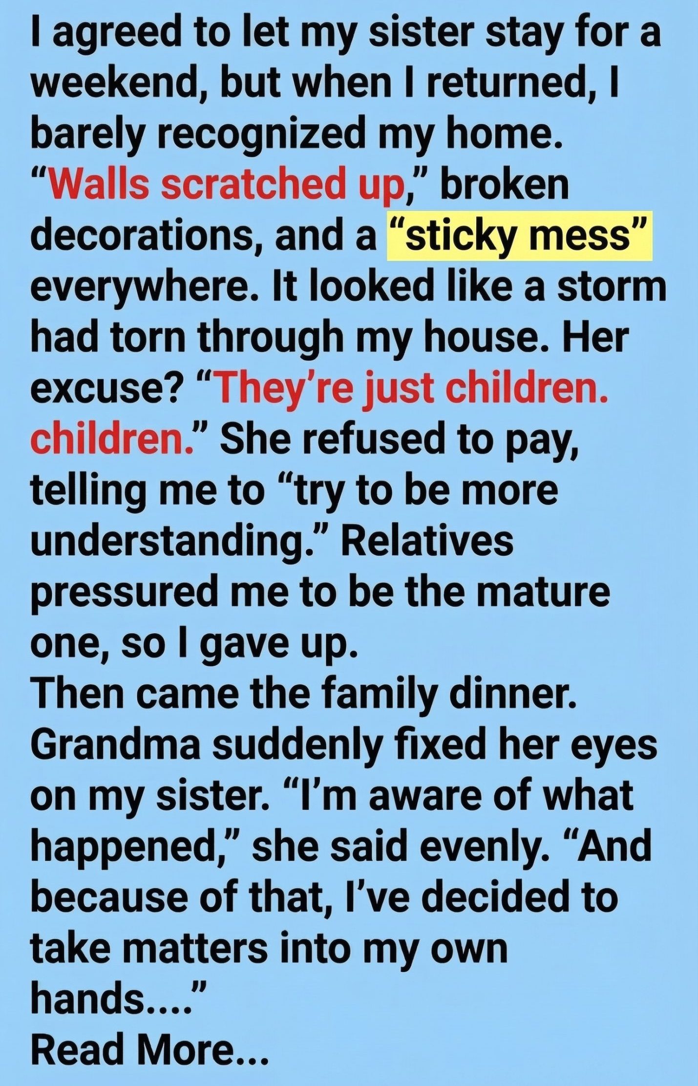 When my sister Lena asked to stay at my house for the weekend, all I heard was family in need — no warning bells. She’d just finalized a bitter divorce, said she and her kids had nowhere else to go until Monday, and I didn’t have the heart to refuse.