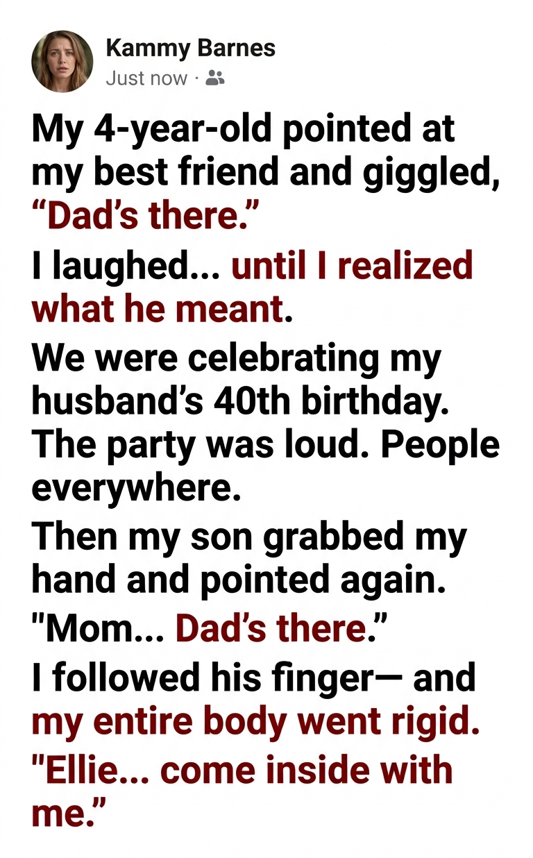 At my husband’s 40th birthday party, my four-year-old son pointed at my best friend and said, “Dad’s there.” I laughed at first, assuming he was just being silly—until I followed where he was pointing and noticed something on her body. In that moment, my son revealed something I was never meant to discover.
