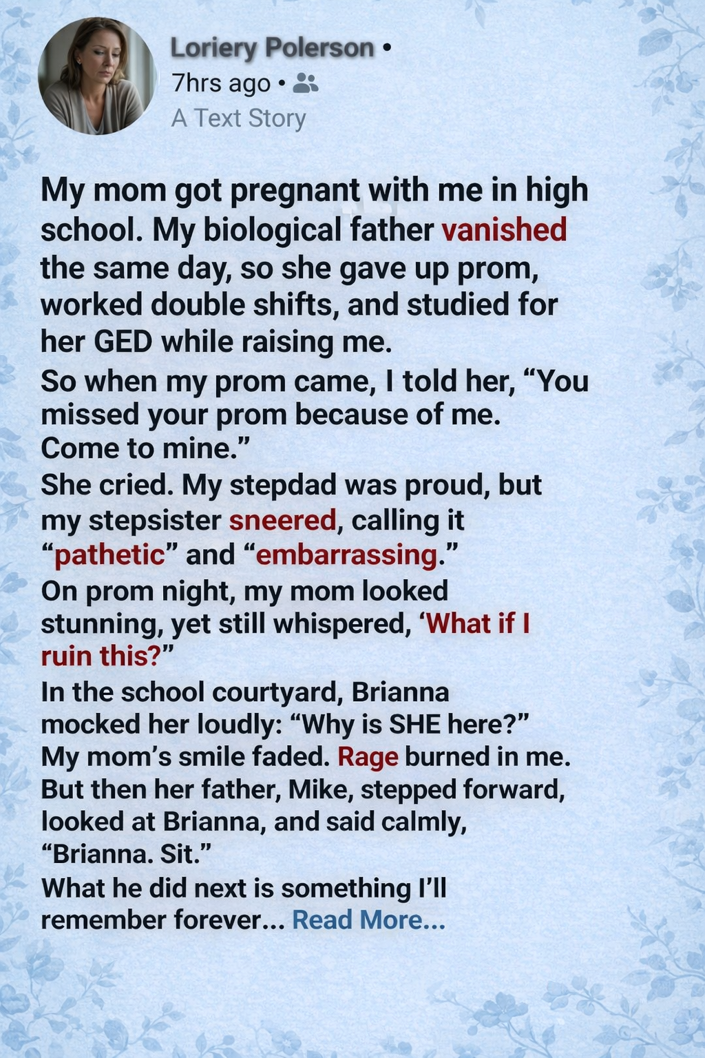 On prom night, she came down the stairs in a simple navy-blue dress. Nothing flashy. Nothing dramatic. But she looked stunning. Confident. Beautiful in a way that had nothing to do with age.
