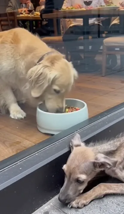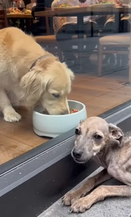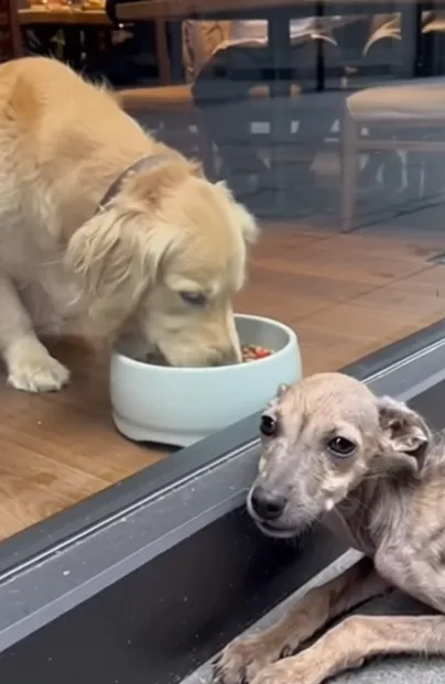 The golden dog let out a soft, confused whine. He looked at his own bowl of food, and then he looked back at the starving skeleton outside.