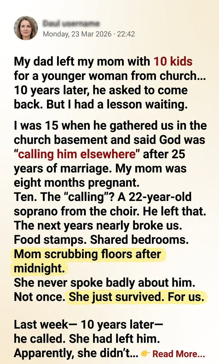 By the time I walked into the kitchen, half my siblings were pretending not to eavesdrop. Mom sat at the table with her phone in front of her like it might bite. Her eyes were red, but her voice stayed steady when she said, “He wants to come home.”