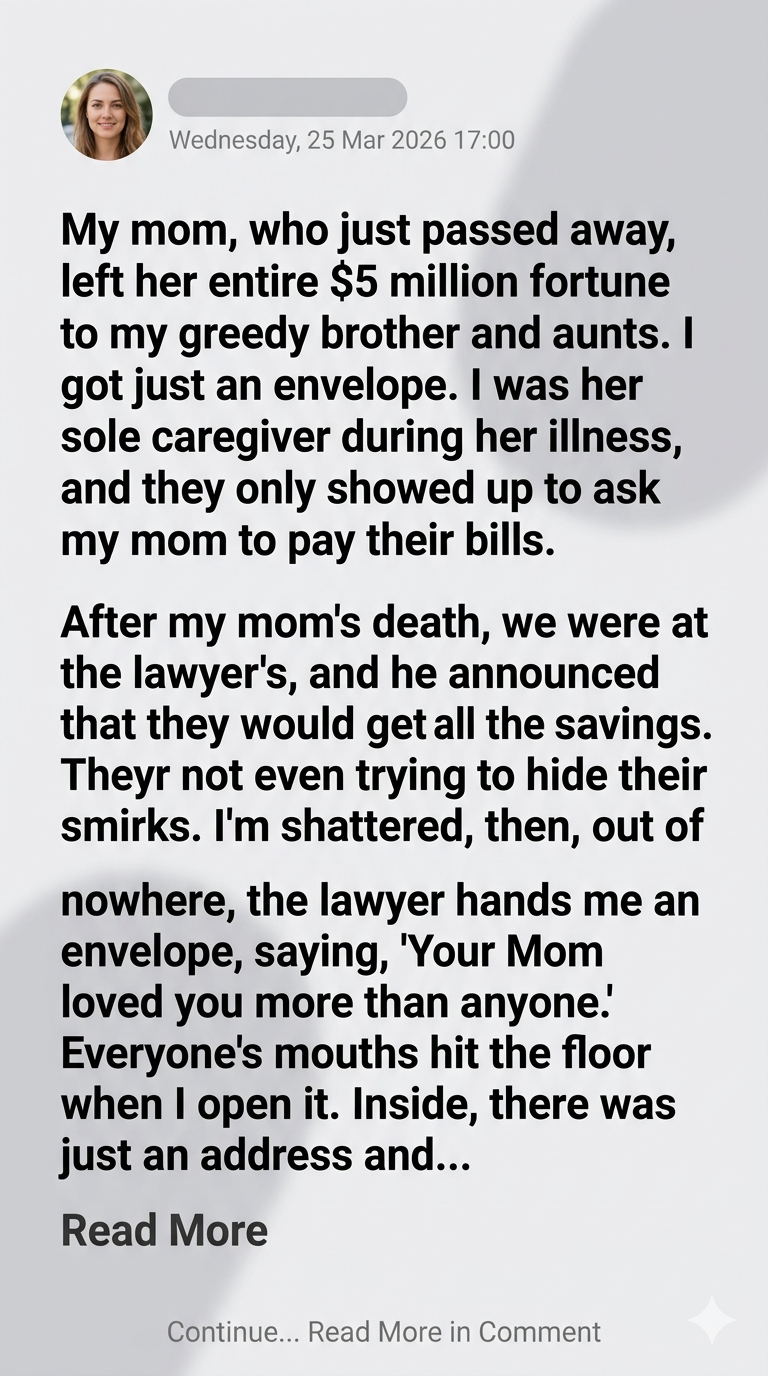The lawyer cleared his throat, adjusting his spectacles. “And for you,” he said, his voice devoid of warmth, “your mother left… this.” He pushed a plain, cream-colored envelope across the polished mahogany table. No dramatic reveal, no explanation. Just a small, unassuming envelope. That was it.