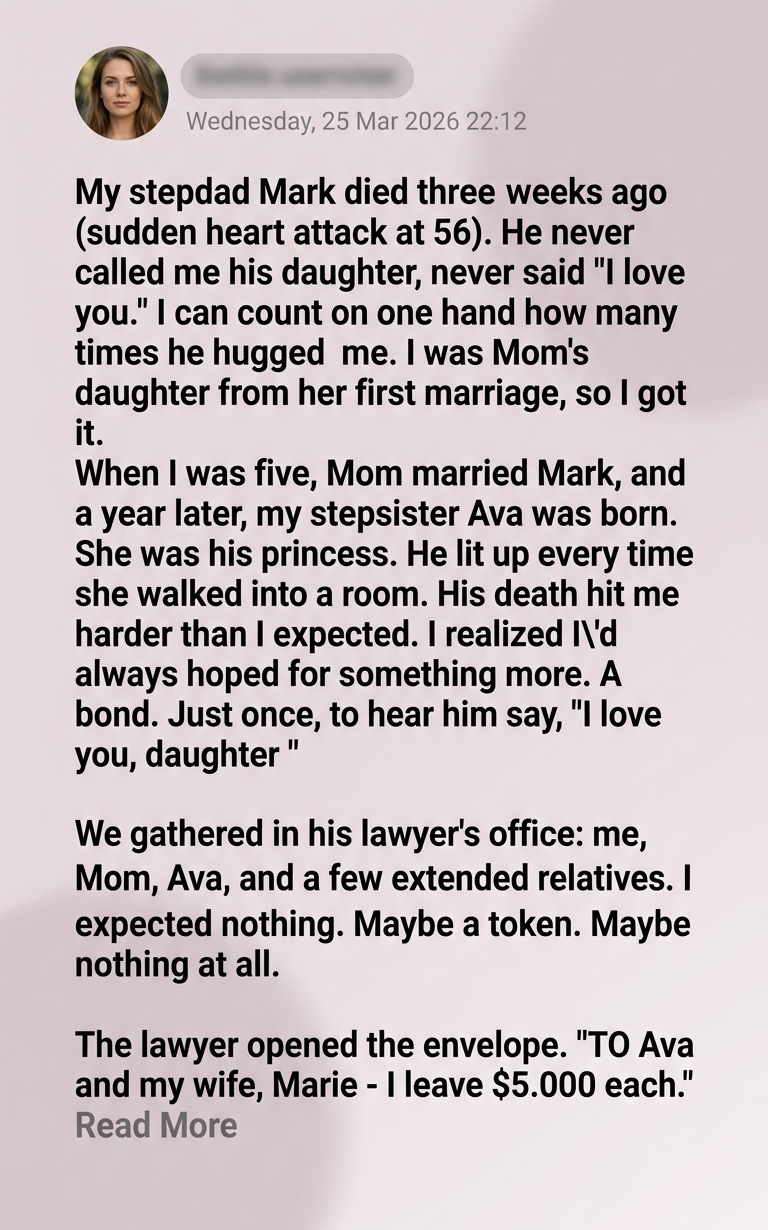I got everything—his $640K estate. My mom and Ava got $5K each. I was stunned.
