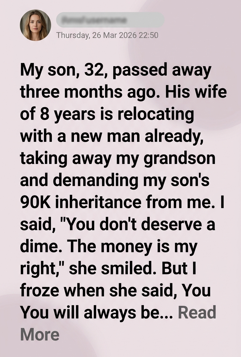 She looked down for a moment. “You think it’s easy? You think I wanted this?” she whispered. “Every day I wake up and remember he’s gone. But our son still needs stability. He still needs a future.”