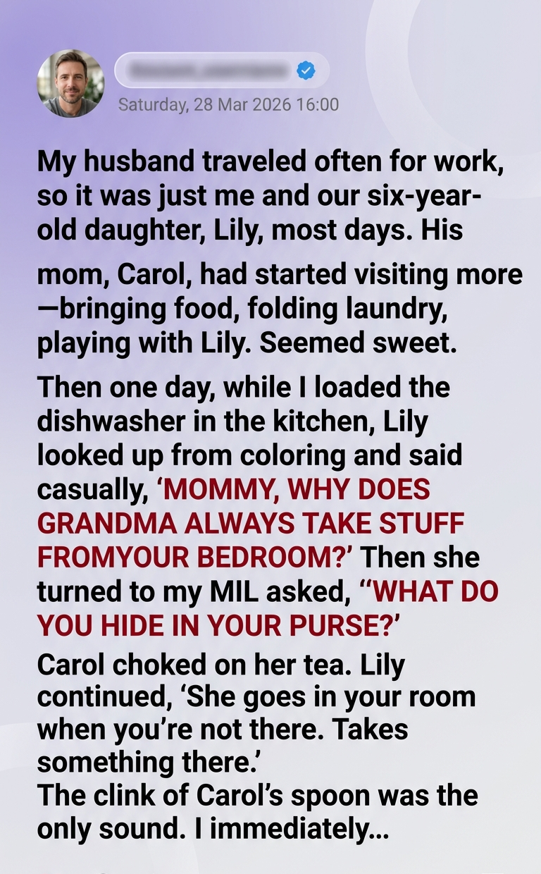 When my six-year-old asked her grandma what she was hiding in her purse, I thought it was just a silly question. But then she said Grandma had been sneaking into my bedroom. What I found inside that bag unraveled everything I thought I knew about my marriage — and my family.This year had already been heavy. James had taken that fancy promotion six months ago and had been splitting his time between cities ever since. He was gone half the week, every week.
