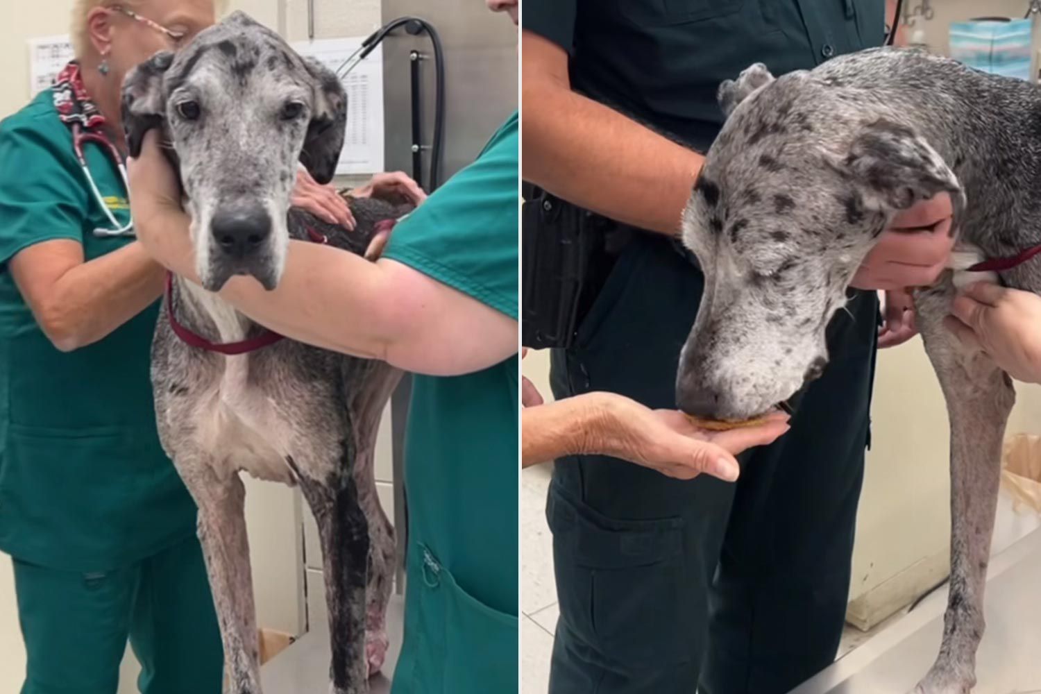 Even from thirty feet away, the sheer, imposing scale of the animal took my breath away. He was a Great Dane, a breed known for its quiet majesty and gentle giant demeanor, but this dog was a walking tragedy. A standard male Great Dane of his towering height should easily weigh nearly two hundred pounds, a solid wall of muscle and grace. This poor creature was a jagged landscape of bone. He weighed perhaps a hundred and forty-eight pounds, and I could tell immediately because there was absolutely no fat, no muscle left to hide his skeletal frame. Every single rib protruded sharply against his thin, brindle coat. His hip bones jutted out like the corners of a wooden crate hidden beneath a velvet sheet. His massive head seemed entirely too heavy for his withered neck to support.