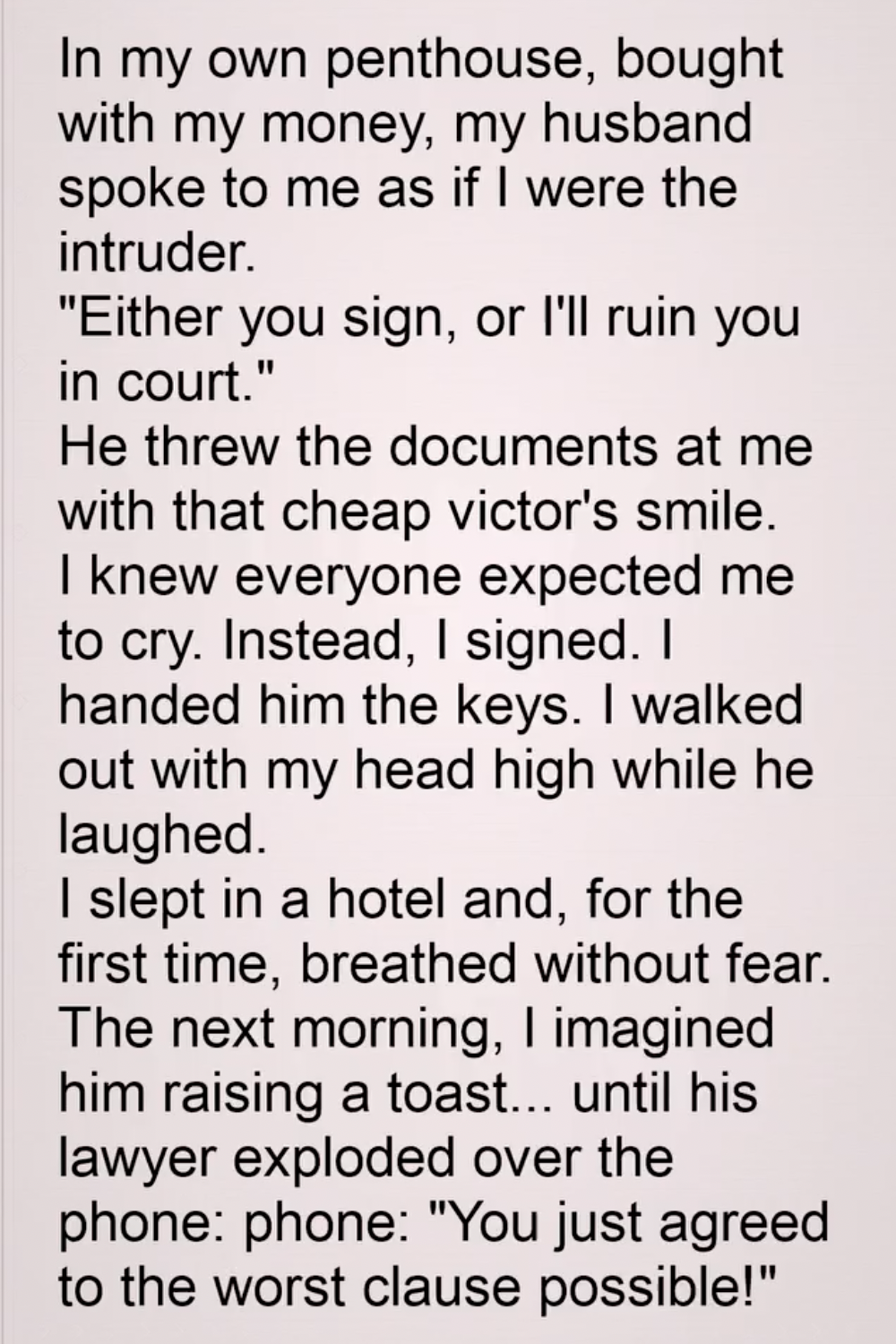 In my own penthouse, bought with my money, my husband spoke to me as if I were the intruder. “Either you sign, or I’ll ruin you in court.” He threw the documents at me with that cheap victor’s smile. I knew everyone expected me to cry. Instead, I signed. I handed him the keys. I walked out with my head high while he laughed. I slept in a hotel and, for the first time, breathed without fear. The next morning, I imagined him raising a toast… until his lawyer exploded over the phone: “You just agreed to the worst clause possible!” I wasn’t running away. I was closing a trap.