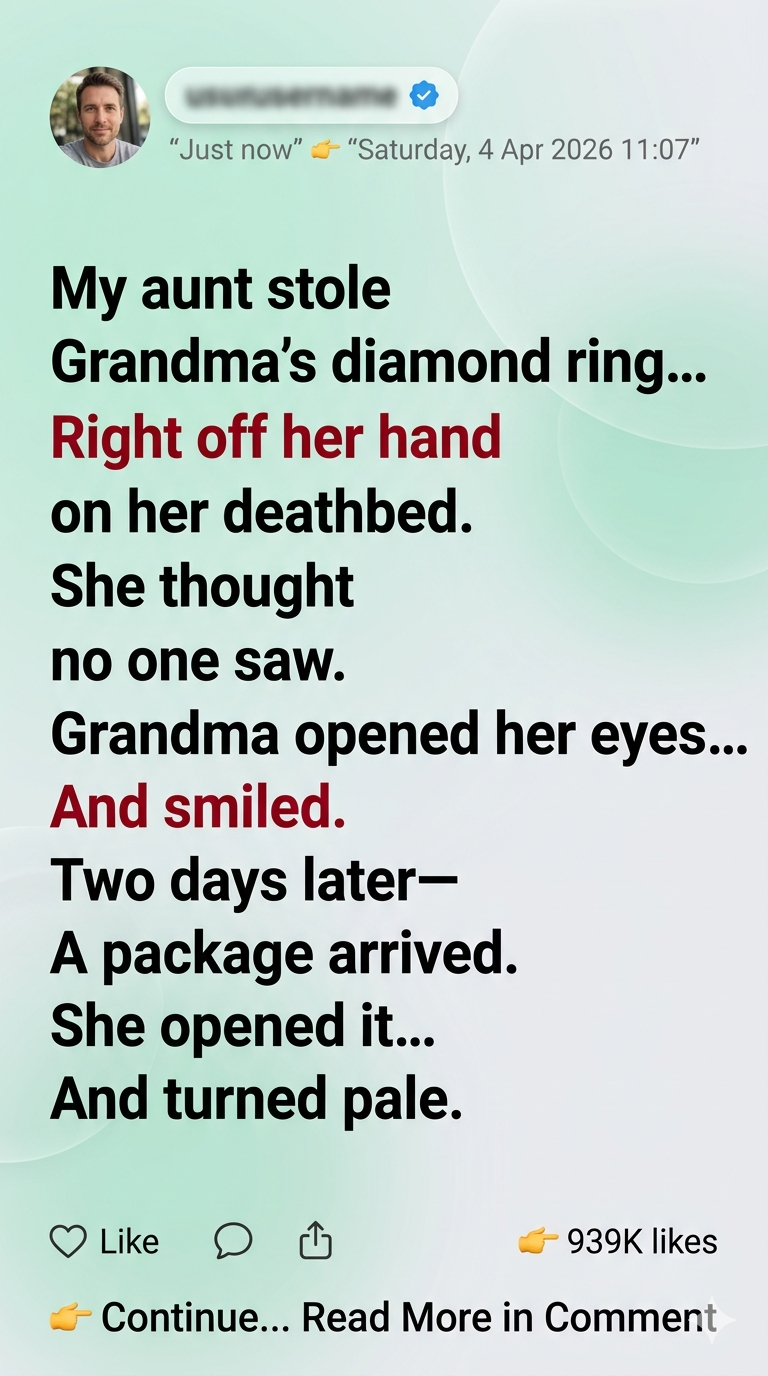 My aunt slipped grandma’s diamond ring off her finger on her deathbed, thinking she didn’t notice — two days after the funeral, a package arrived that made her turn pale.
