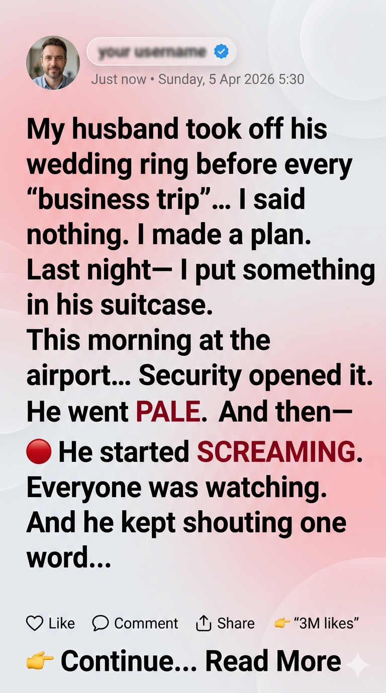 For six months, my husband slipped off his wedding ring before every business trip and thought I never noticed. I felt something wasn’t right. So I packed his suitcase with something he couldn’t possibly miss, expecting him to find it privately. I didn’t expect airport security to open it first.